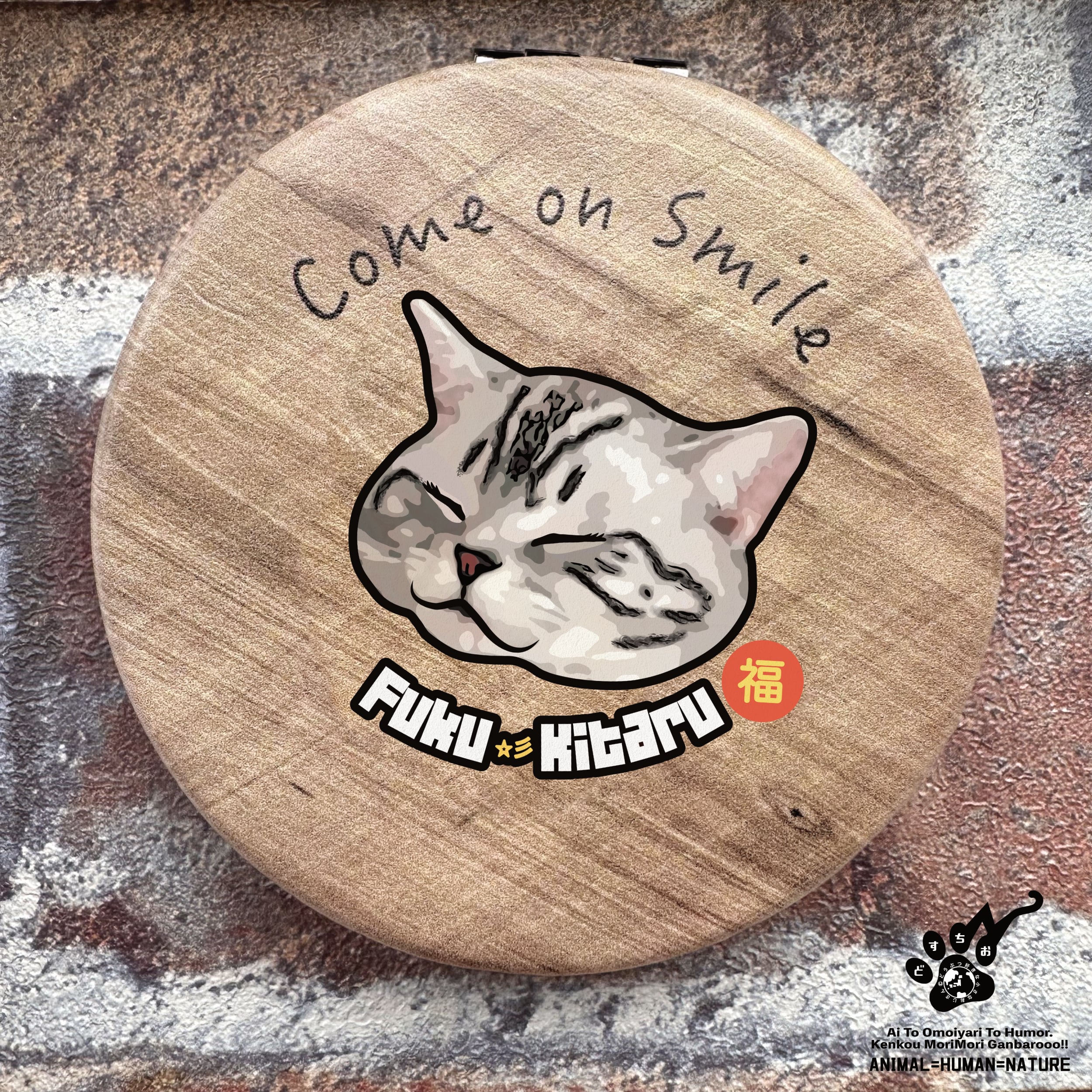 コンパクト ミラー | ウッド調 レザー (非動物性) 鏡 |【ふくきたるデザイン x No #72 みるくさん】 ねこ・猫・cat・アニマル・動物|メンズ・レディース・男女兼用