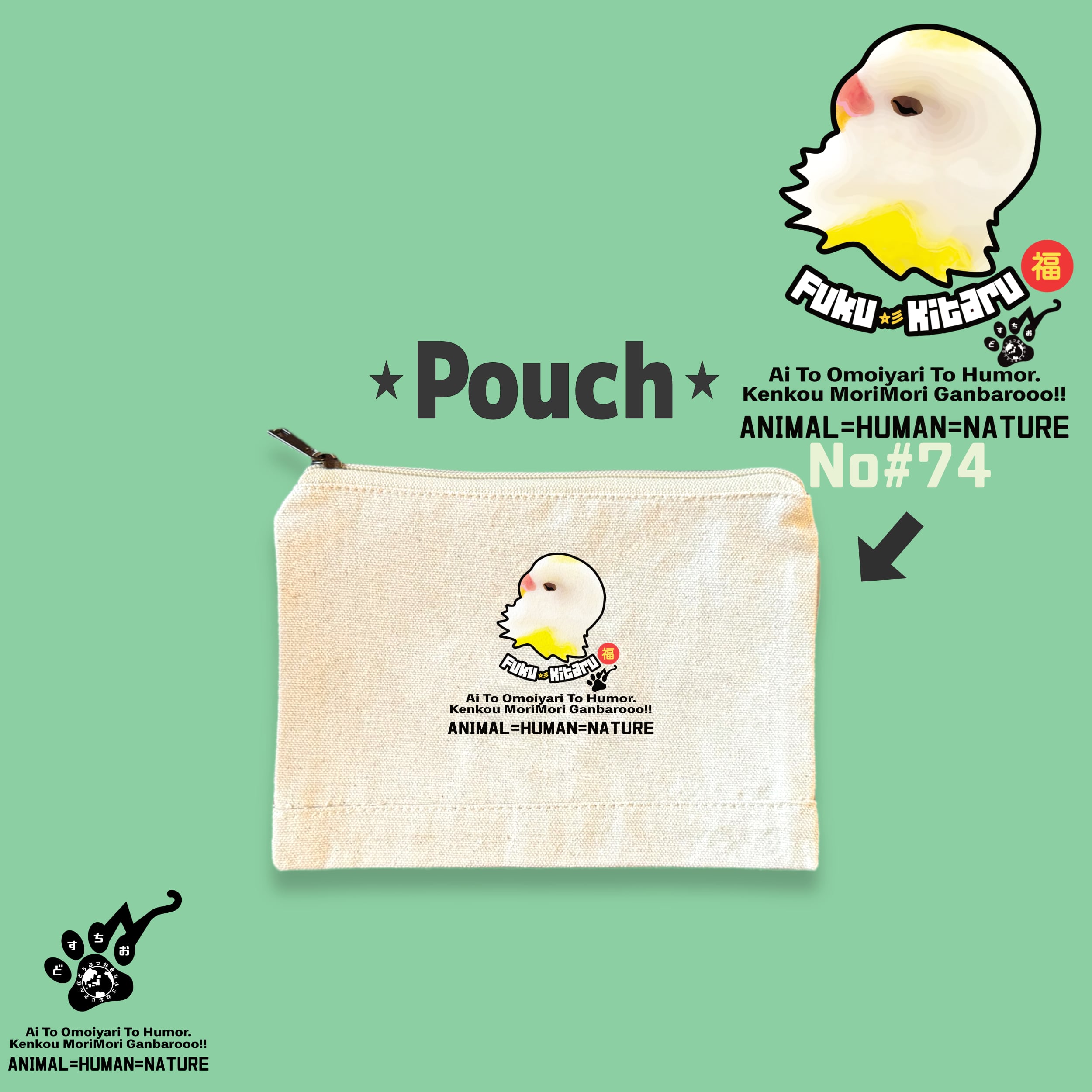 オーガニックコットン ポーチ【ふくきたるデザイン x No #74 モツさん】|キャンバス生地・鳥・インコ・とり・トリ・動物・アニマル|メンズ レディース 男女兼用