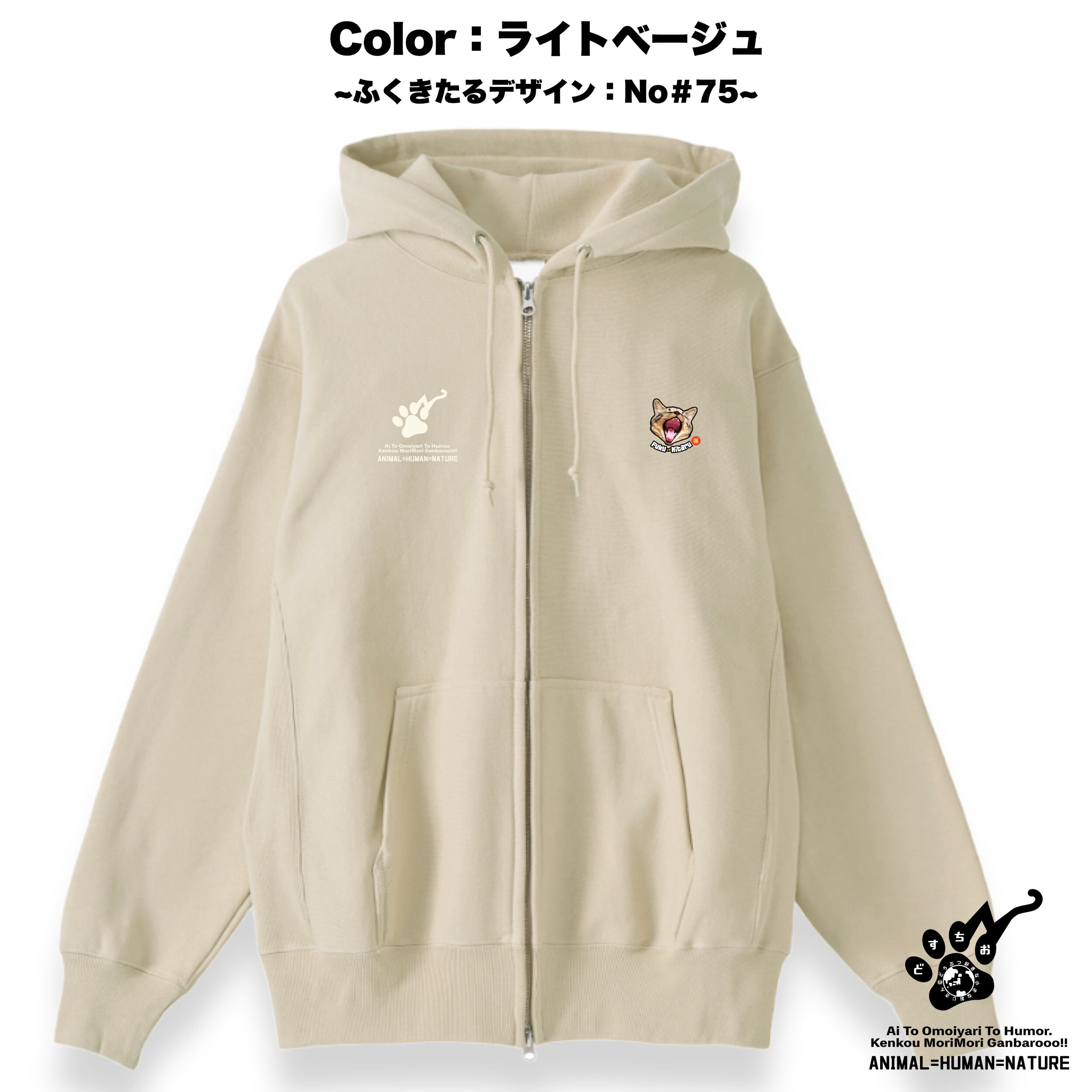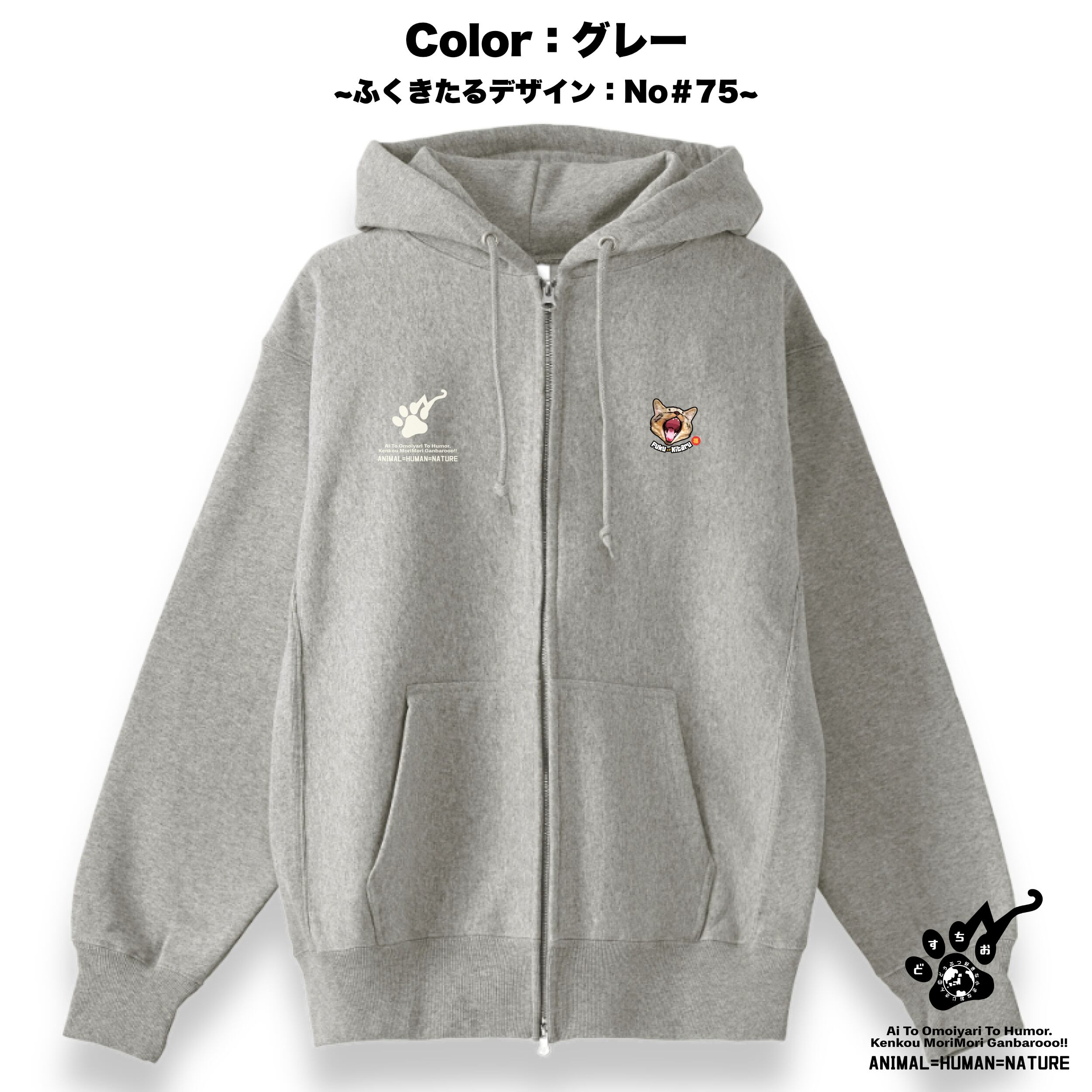 ジップアップ パーカー | 裏起毛 厚手 | スウェット | 長袖 トレーナー 【 ふくきたるデザイン x No #75 チャチャ太郎さん】 ねこ 猫 cat アニマル 動物|メンズ・レディース・男女兼用