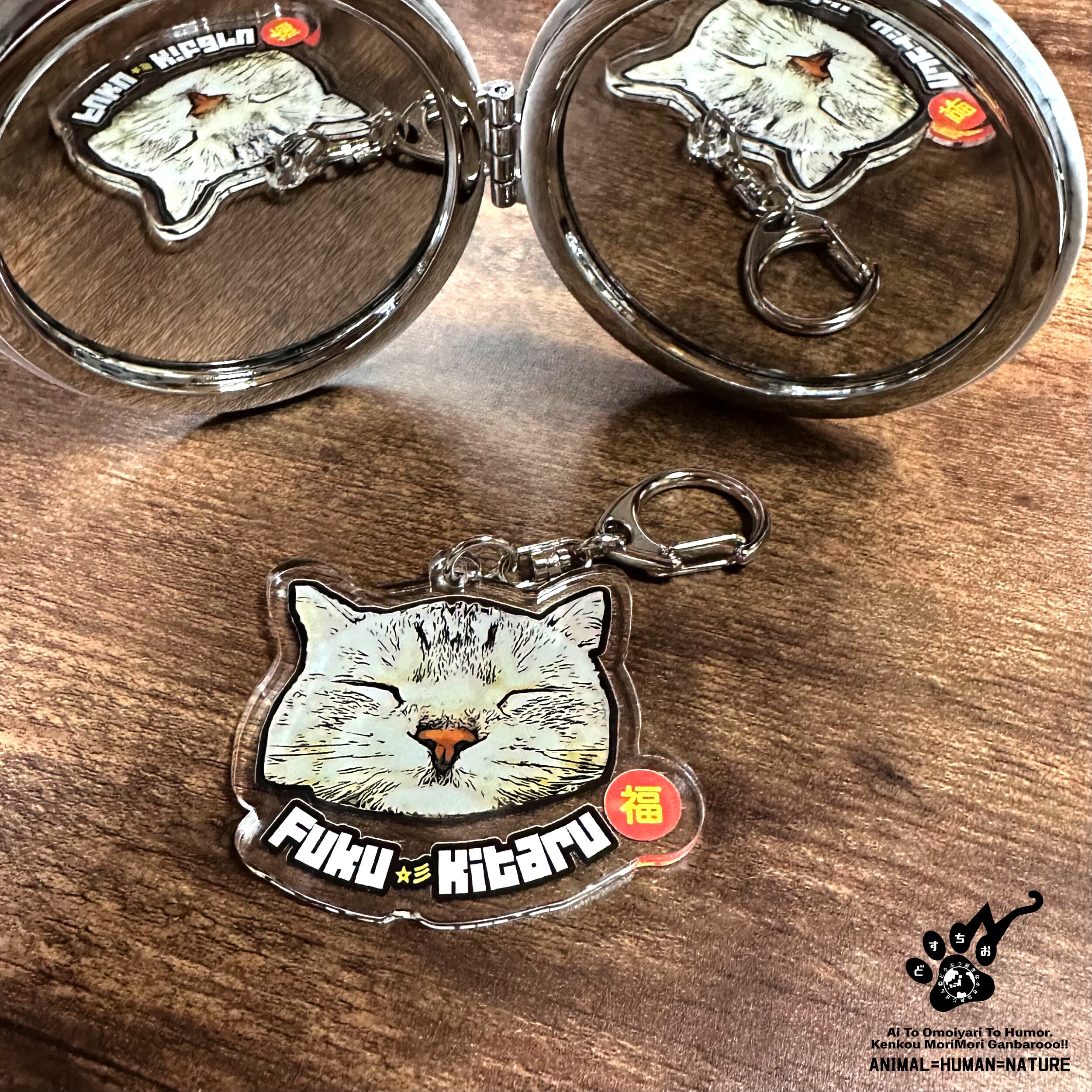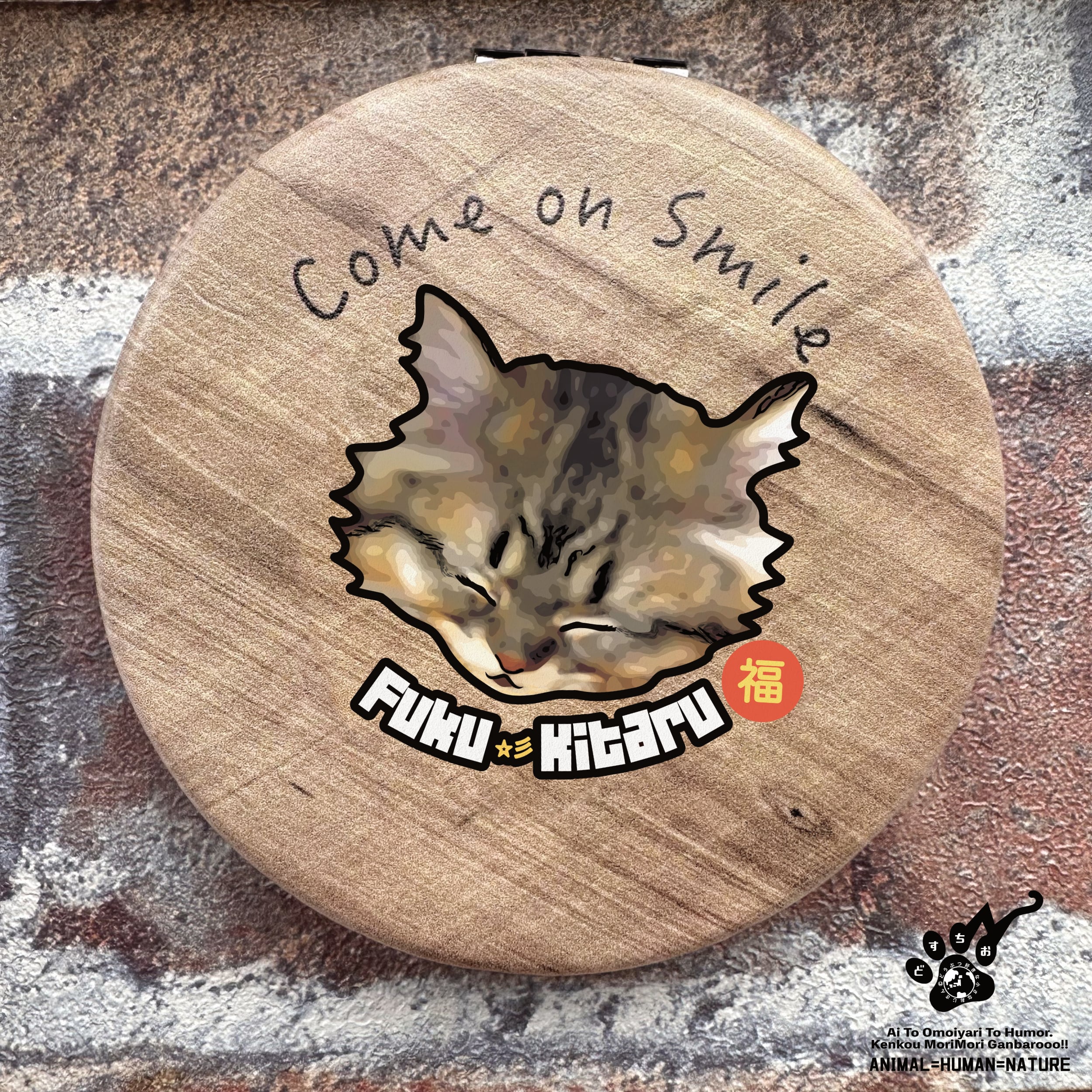 コンパクト ミラー | ウッド調 レザー (非動物性) 鏡 |【ふくきたるデザイン x No #76 おもちさん】 ねこ・猫・cat・アニマル・動物|メンズ・レディース・男女兼用
