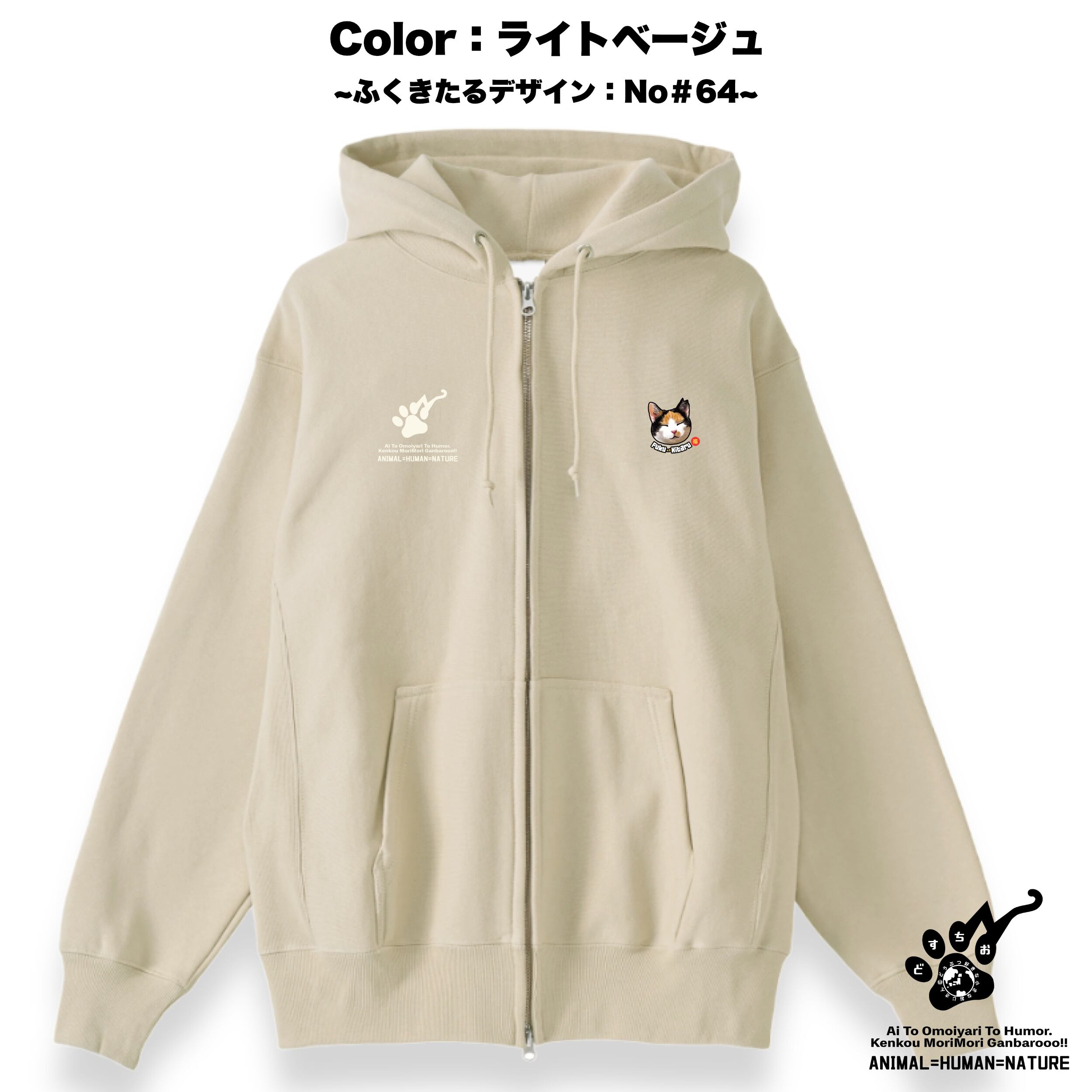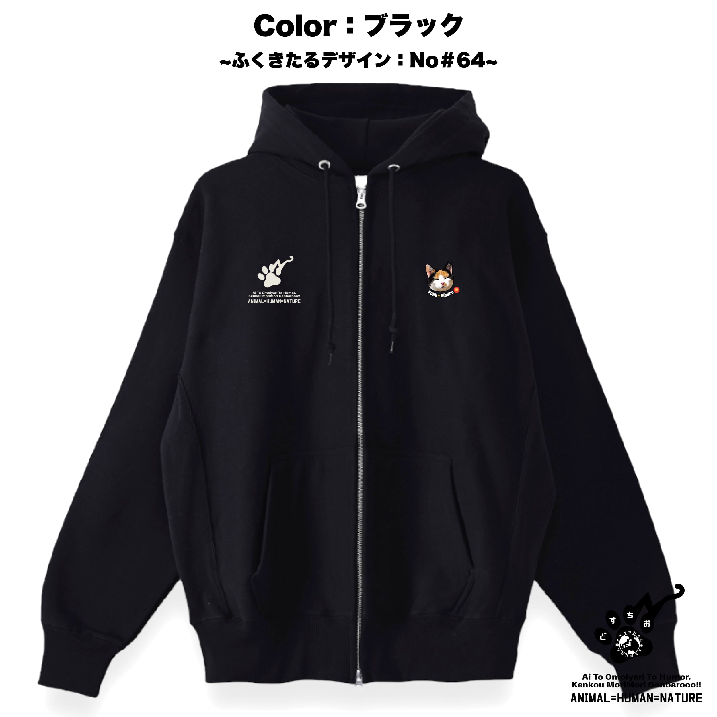 ジップアップ パーカー | 裏起毛 厚手 | スウェット | 長袖 トレーナー 【 ふくきたるデザイン x No #64 シャーさん】 ねこ 猫 cat アニマル 動物|メンズ・レディース・男女兼用